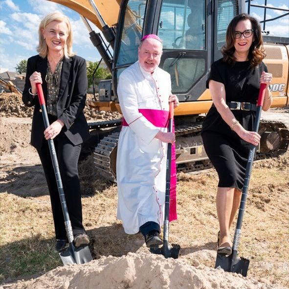 Pictured: Mercy Health Board Chair Virginia Bourke (left), Mercy Health Group CEO Angela Nolan (right) with Auxiliary Bishop for Melbourne and CDF Board Member, Anthony Ireland, at the Blessing and Turning of the Sod at Mercy Place Mentone.