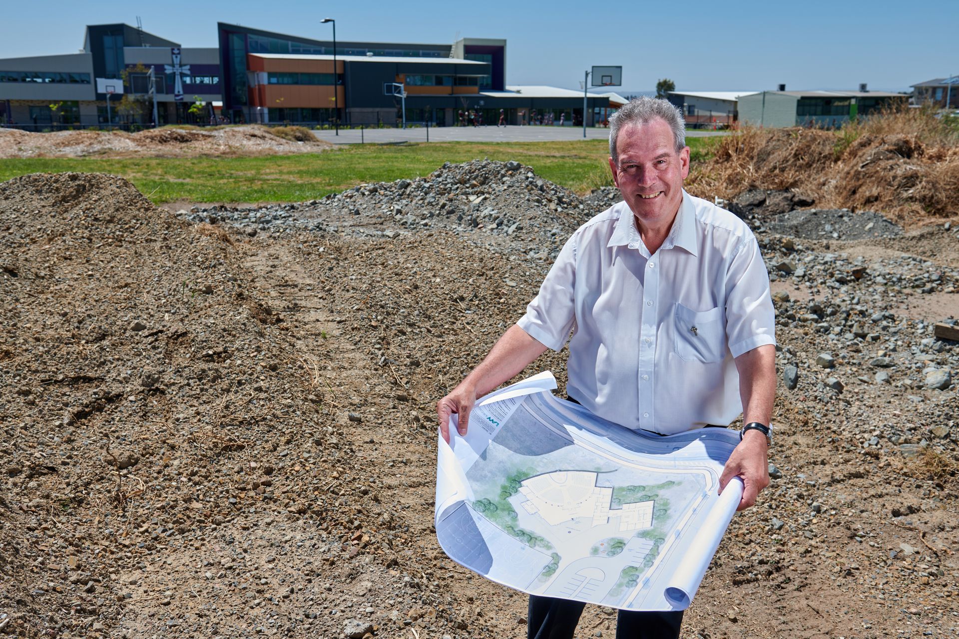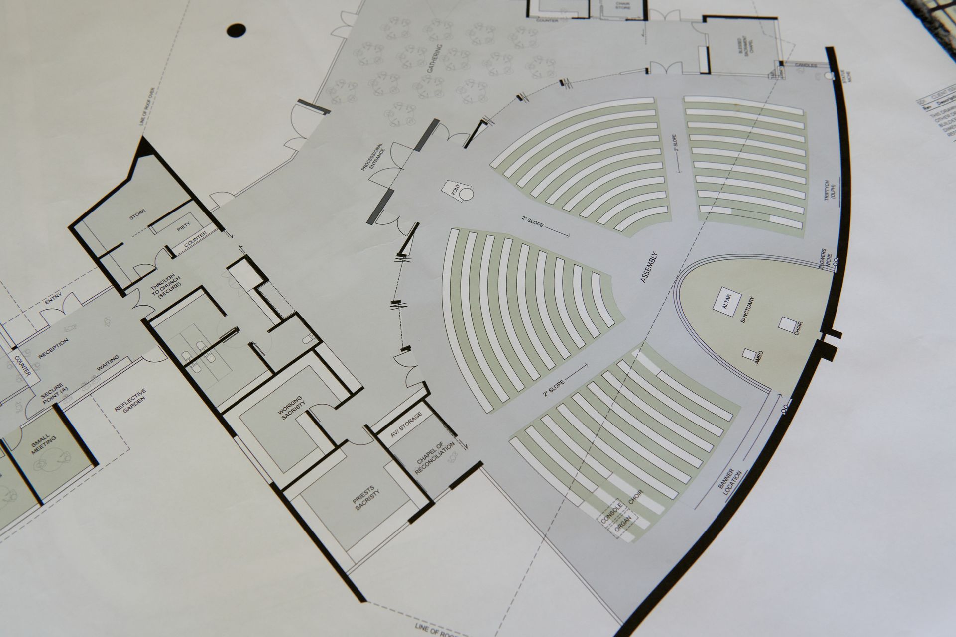Parish Priest, Fr Denis, photographed by CDF in 2018, holding the St Thomas the Apostle Church master-plans ahead of construction commencing.